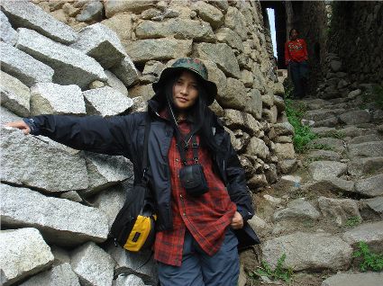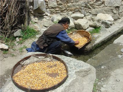 那天清晨,我們一行就乘坐曉雨哥所開轎車從康定城出發了。從顯得很懸的山路上到位于山頂平壩的嵐安古鎮時,才8點過一點。朝鎮里走去,先后見到了從地里背洋芋回家的小孩、從地里收了豆菽枯藤的中年人等。