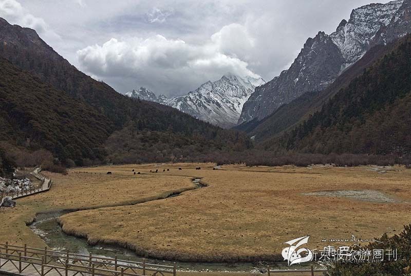 大概20分鐘左右的車程,我們到了洛絨牛場。這是一個被雪山環繞的草甸,仙乃日、央邁勇和夏郎多吉三座6000米的雪峰呈“品”字形分別位于西北、東南和東面,雪峰之間,形成了一片長寬約5公里的高原寬谷。
