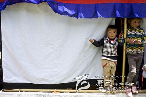 白玉縣,拉沙石的馬幫。 白玉縣,德沙村一民居內孩子在帳篷邊玩耍。