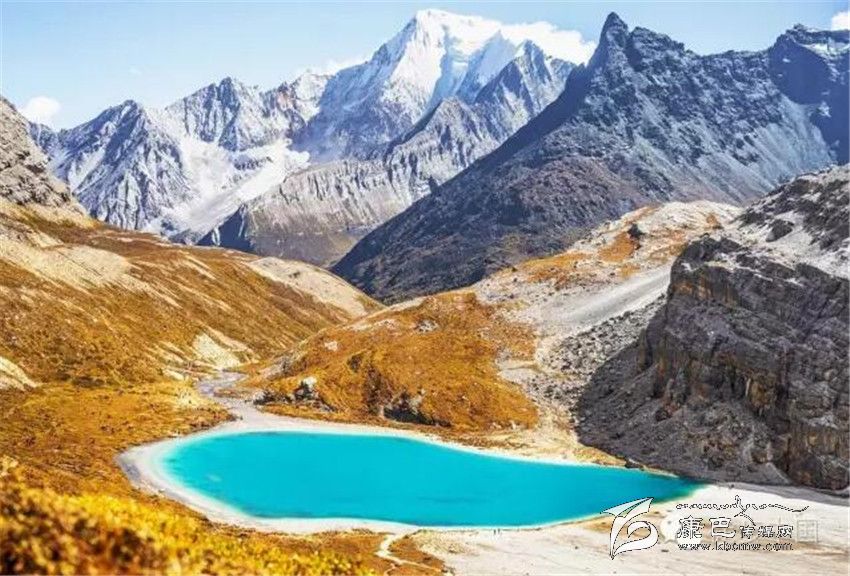三神山中間的牛奶海,美麗的高原堰塞湖,面積0.5公頃,海拔4500米,四周雪山環繞,湖水清瑩碧藍,山上成瀑,以其玲瓏秀雅水色翠藍而著名,牛奶海上方有大片的冰川。傳說每年春暖花開之時,湖水會像牛奶一樣潔白如瓊漿,并因此得名牛奶海。